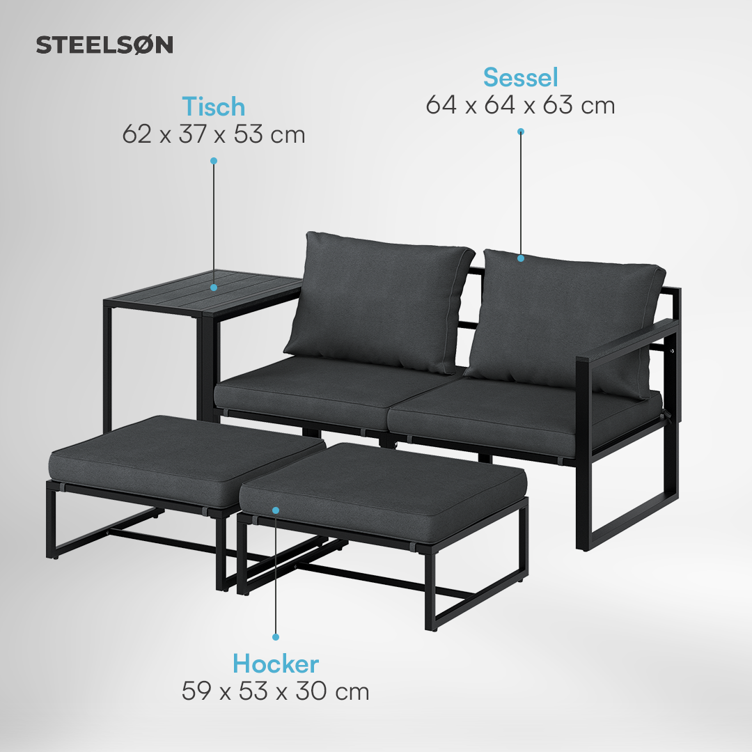 Die Sitzgarnitur „Asteri“ von STEELSØN vereint modernes Design mit praktischer Funktionalität. Das Set besteht aus zwei Sesseln, zwei Hockern und einem Tisch und eignet sich ideal für Terrasse, Garten oder Balkon.