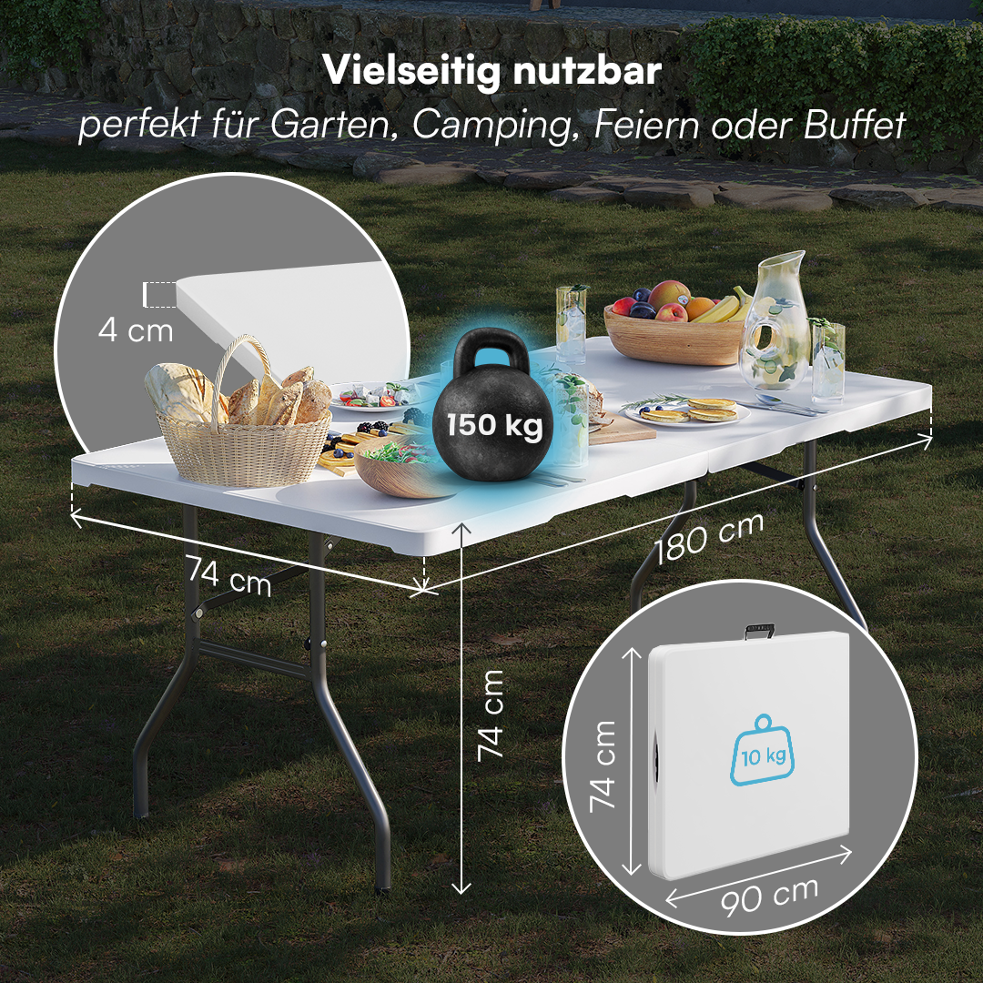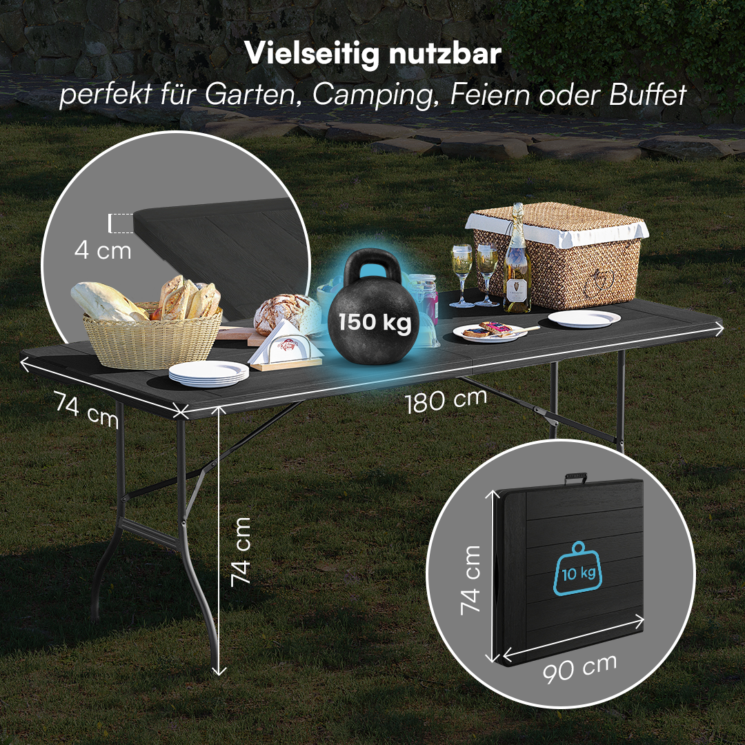 Das pulverbeschichtete Stahlgestell mit 25 mm Rohrdurchmesser sorgt für Stabilität, während gummierte Schutzkappen Kratzer auf empfindlichen Böden verhindern. Mit Maßen von 180 × 74 × 74 cm bietet der Tisch Platz für bis zu 8 Personen.