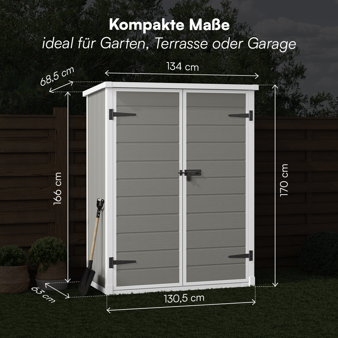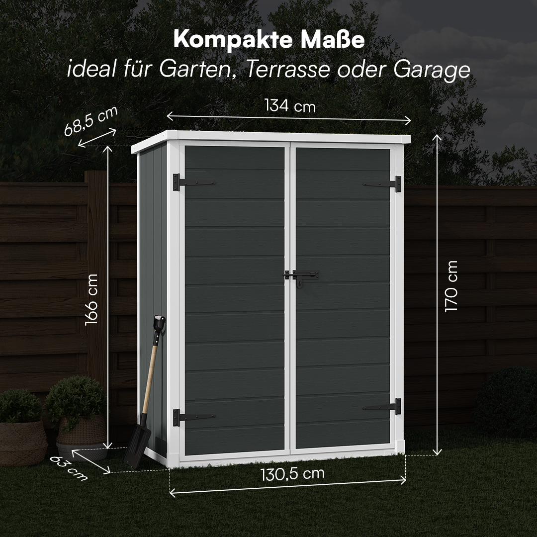 Dank seiner kompakten Außenmaße von 134 × 68,5 × 170/166 cm lässt sich das Gerätehaus auch in kleineren Außenbereichen optimal platzieren. Es ist die perfekte Wahl für alle, die eine zuverlässige und langlebige Aufbewahrungslösung suchen, ohne dabei auf Stil und Ästhetik zu verzichten.