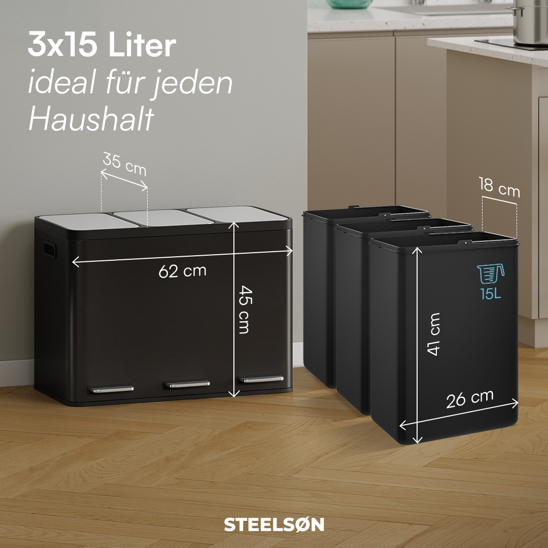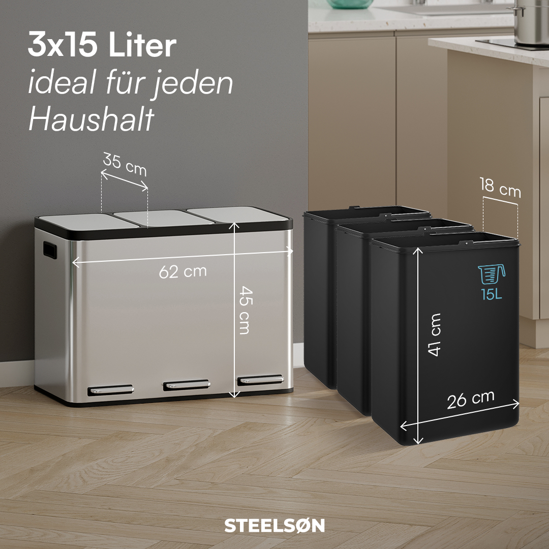 Ausgestattet mit zwei herausnehmbaren 15-Liter-Eimern lässt sich Abfall bequem trennen. Die separaten Fußpedale ermöglichen ein unabhängiges Öffnen, während die Soft-Close-Funktion für geräuschloses Schließen sorgt. Für längere Arbeiten können die Deckel in geöffneter Position fixiert werden.