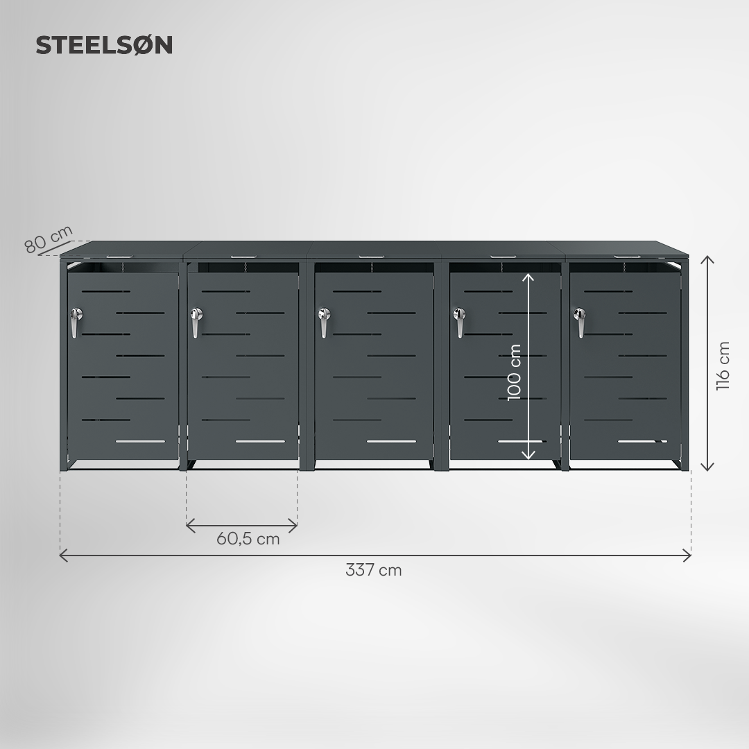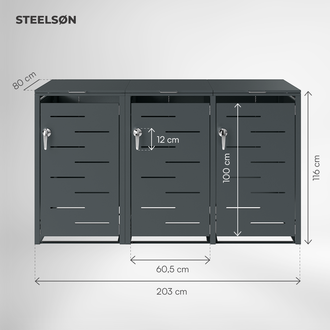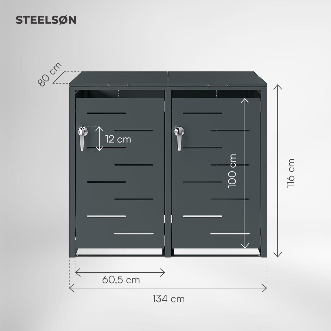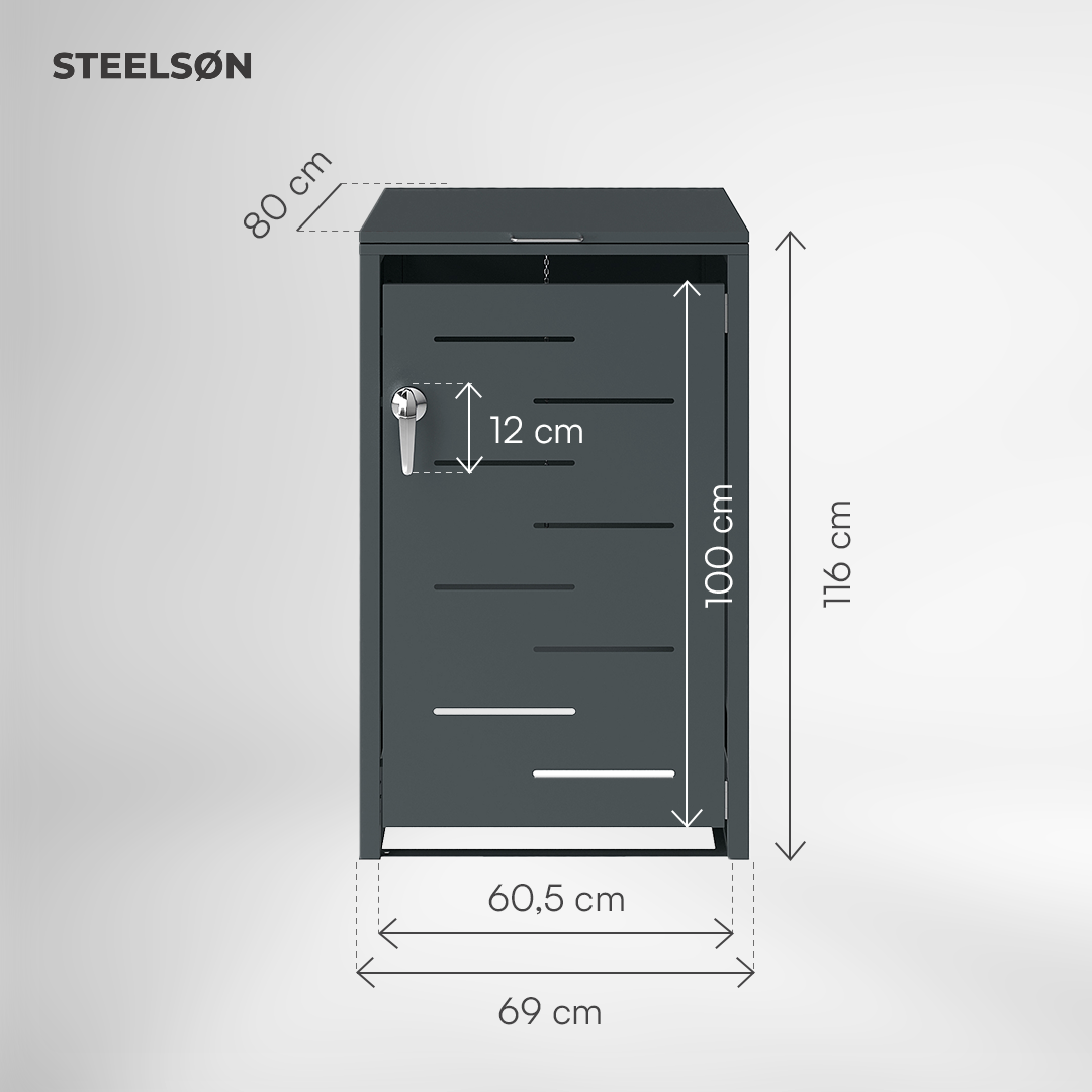 Die Mülltonnenbox Diorus verbindet elegantes Design mit hoher Funktionalität. Sie bietet Platz für Abfallbehälter bis 240 Liter und schützt zuverlässig vor Witterung, Tieren und Vandalismus. Mit ihrer robusten Stahlkonstruktion und der Pulverbeschichtung in Anthrazit fügt sie sich harmonisch in moderne Eingangsbereiche oder Gärten ein.