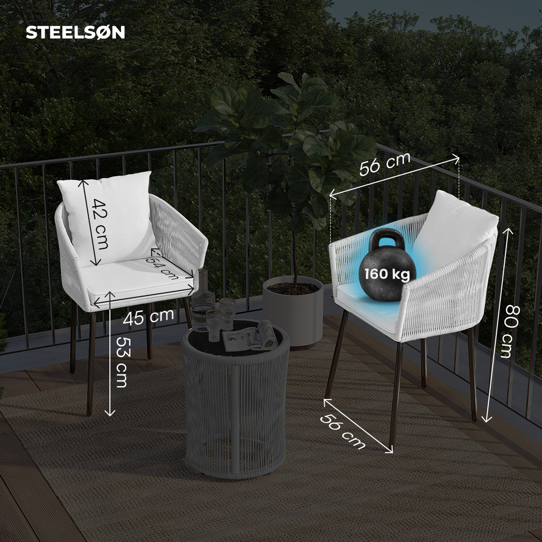 Mit ihrem robusten, pulverbeschichteten Metallgestell und dekorativem Seilgeflecht in Rope-Optik bringen die Stühle ein trendiges Design in jeden Außenbereich. Weiche Sitz- und Rückenkissen sorgen für hohen Komfort – ideal für entspannte Momente auf Balkon, Terrasse oder im Garten.