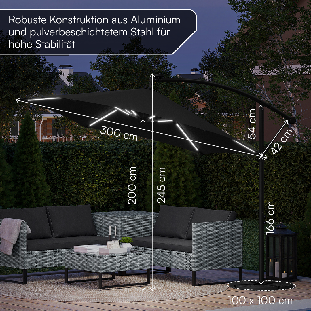 Ein besonderes Highlight sind die integrierten LED-Lampen an den Schirmrippen, die für stimmungsvolles Licht sorgen. Das Solarpanel lädt sich tagsüber auf und versorgt die LEDs am Abend mit Energie – ganz ohne zusätzliche Stromquelle.