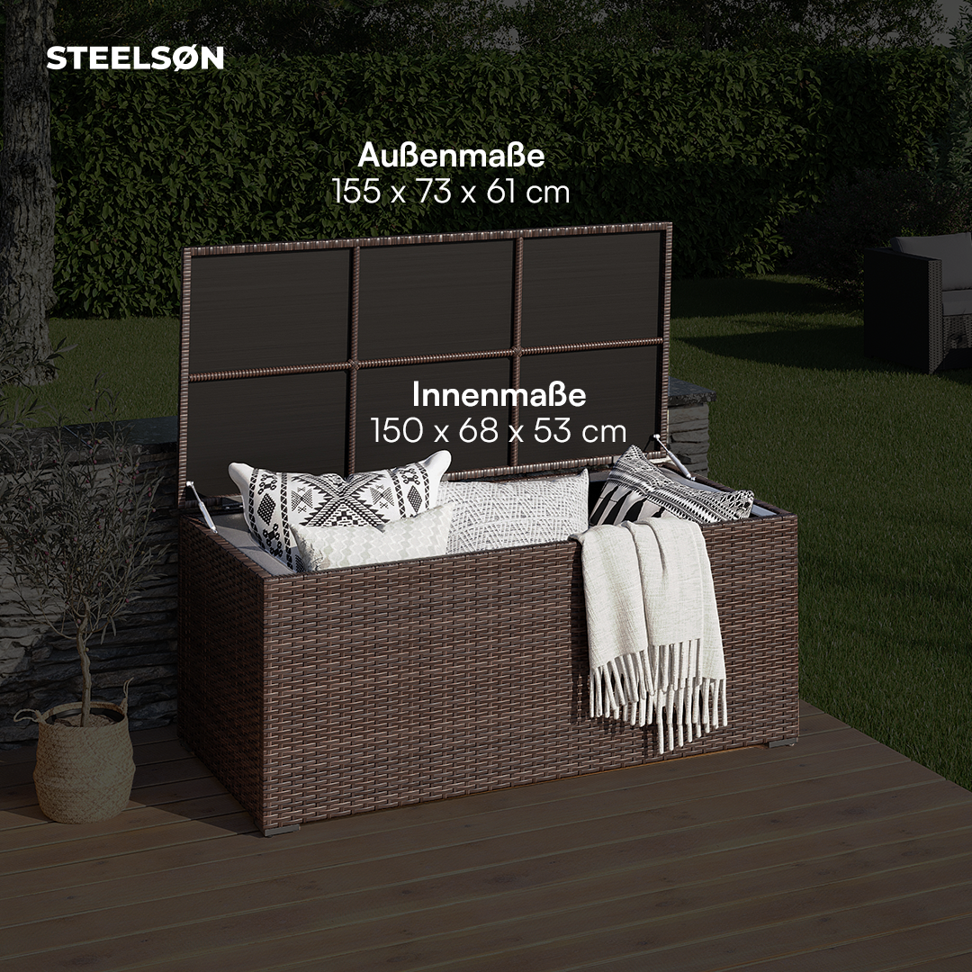 Mit einem großzügigen Volumen von 615 Litern und Außenmaßen von 155 × 73 × 61 cm bietet die Box reichlich Platz für Auflagen, Kissen oder Gartenaccessoires. Selbst große Liegenauflagen lassen sich problemlos verstauen.
