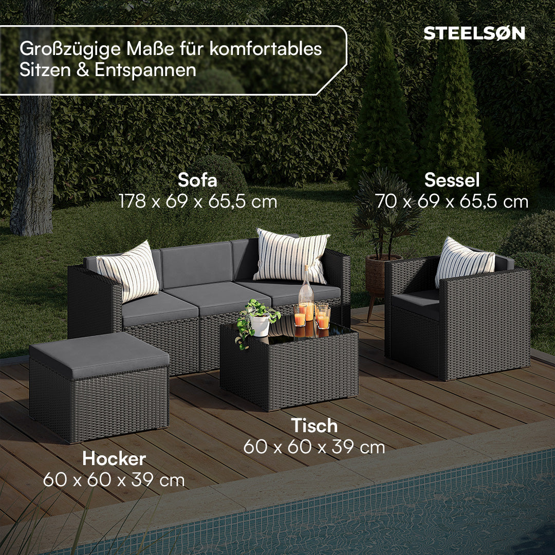 Dank der kompakten Maße lässt sich die Gruppe flexibel arrangieren und passt sowohl in kleinere Balkone als auch in großzügige Gärten. Der UV-Schutz bewahrt die Farben, und für die Reinigung genügt ein feuchtes Tuch.