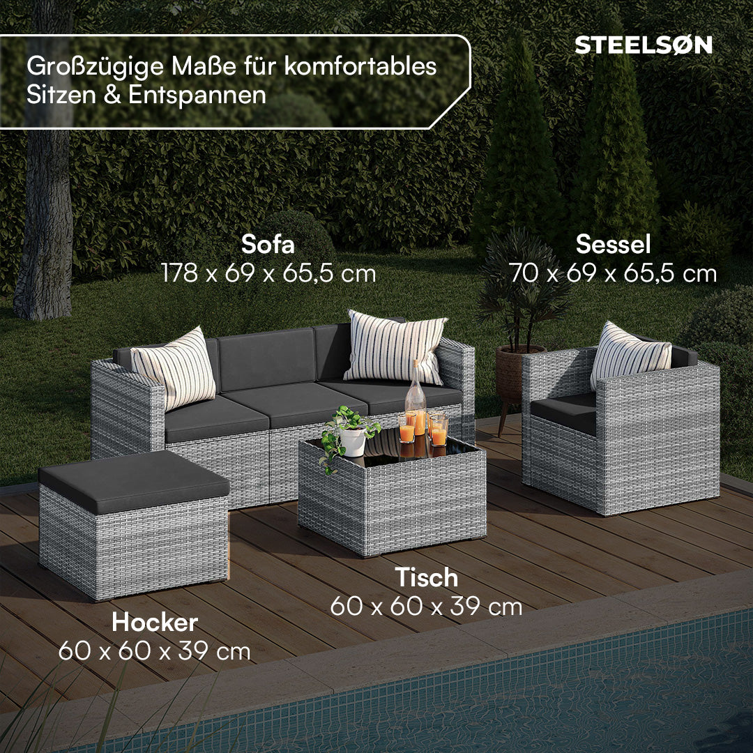 Verleihen Sie Ihrem Außenbereich einen modernen und gemütlichen Charakter. Die Sitzgruppe Zethora besteht aus einem komfortablen 3er-Sofa, einem Hocker und einem Tisch – ideal für Terrasse, Garten oder Balkon.